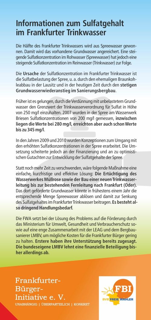 Im Rahmen der Kampagne "Sauberes und bezahlbares Trinkwasser für Frankfurt (Oder)" gab es für die FBI-Mitglieder eine Führung im Wasserwerk Briesen durch die FWA. Herr Weber, Geschäftsführer der FWA und Frau Silchmüller, Referentin für Öffentlichkeitsarbeit, machten die Sulfat-Problematik vor Ort deutlich und wiesen mehrfach auf den dringenden Handlungsbedarf hin. Im Beisein des Landtagsabgeordneten Dr. Philip Zeschmann von BVB/Freie Wähler präsentierten dabei Rudolf Haas (Vorsitzender der FBI) und Frank Zimmermann (Fraktionsvorsitzender FBI/Freie Wähler) rd. 1.500 Unterschriften, die den Aktivitäten der Frankfurter-Bürger-Initiative den nötigen Nachdruck verleihen sollen. Im Rahmen der Führung wurde in beeindruckender Weise die Gesamtproblematik erläutert und in großer Einigkeit diskutiert. Bestärkt wurde die FBI in ihrer Forderung zur Unterschriftenkampagne, dass das Wasserwerk Müllrose SOFORT ausgebaut werden muss und die Kosten in Höhe von rd. 10 Mio Euro dafür von den Verursachern getragen werden müssen. Es darf keinesfalls so sein, dass diese hohen Kosten die Bürgerinnen und Bürger über die Gebühren tragen müssen! Das Land Brandenburg, die LEAG und die LMBV sind hier in der Pflicht!